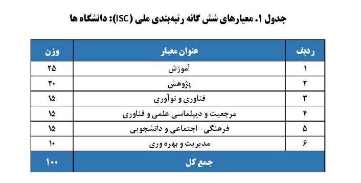 به گزارش شبکه خبری ایران ۲۴ از روابط عمومی مؤسسه استنادی و پایش علم و فناوری جهان اسلام (ISC)، محمدمهدی علویانمهر در این رابطه اظهار داشت: معیارهای جدید رتبهبندی ملی (ISC): دانشگاه ها، در ۶ حوزه آموزش (۲۵ درصد)، پژوهش (۲۰ درصد)، فناوری و نوآوری (۱۵ درصد)، مرجعیت و دیپلماسی علمی و فناوری (۱۵ درصد)، فرهنگی - اجتماعی و دانشجویی (۱۵ درصد) و مدیریت و بهره وری (۱۰ درصد) است.