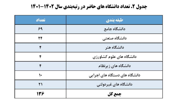 وی گفت: در رتبه بندی سال ۱۴۰۲-۱۴۰۱، مجموعا تعداد ۱۱۵ دانشگاه دولتی و ۲۱ دانشگاه غیردولتی حضور دارند که اطلاعات آنها مورد بررسی و ارزیابی قرار گرفته است و براساس ماهیت، هر یک طبقه بندی شده و مورد رتبه بندی قرار گرفته اند.