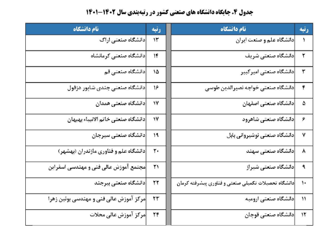 رتبه ۲۴ دانشگاه صنعتی کشور در جدول ۴ نشان داده شده است.