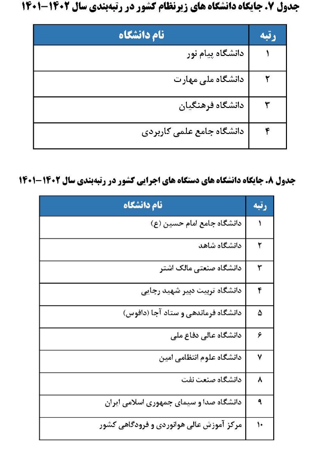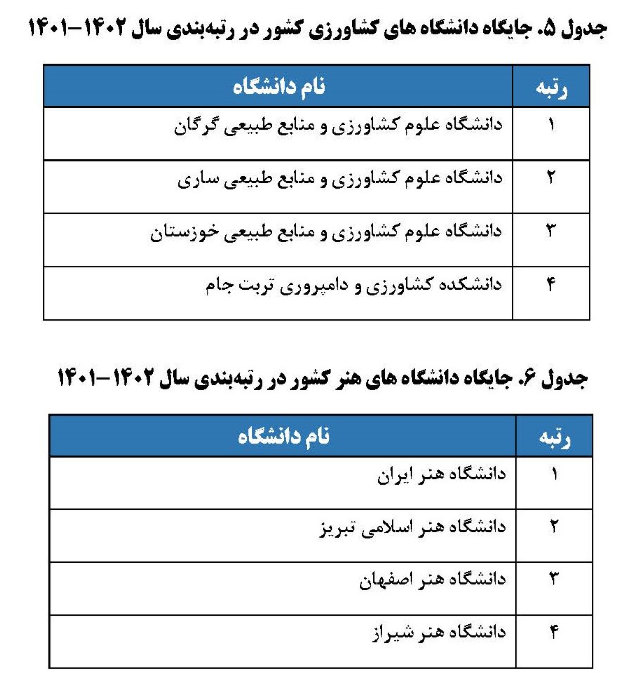 رتبه دانشگاه های کشاورزی، هنر، زیرنظام و دانشگاه های دستگاه های اجرایی در جداول ۵ تا ۸ نشان داده شده است.