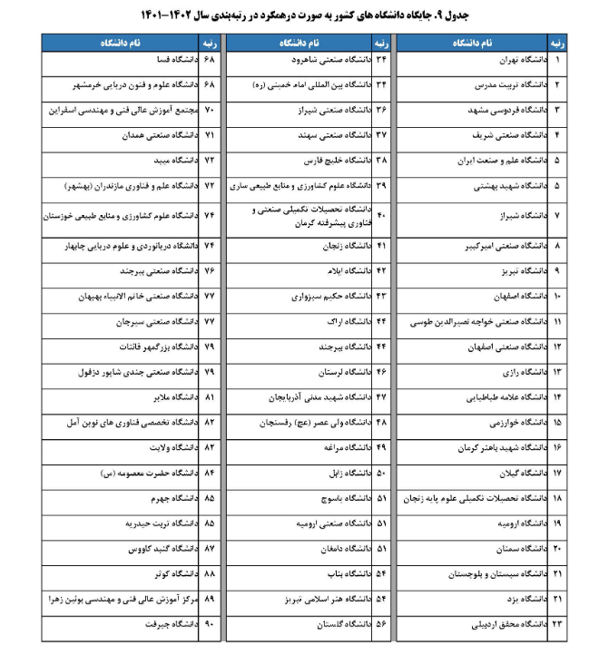 رتبه دانشگاه های کشور به صورت درهمکرد در جدول ۹ نشان داده شده است.