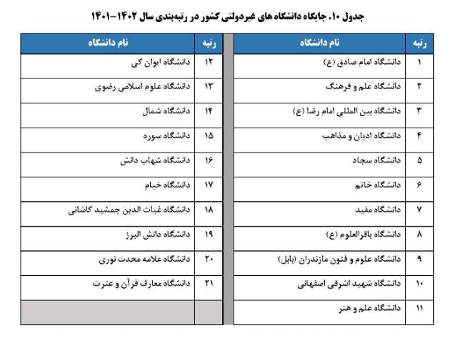 رتبه دانشگاه های غیردولتی در جدول ۱۰ نشان داده شده است.
